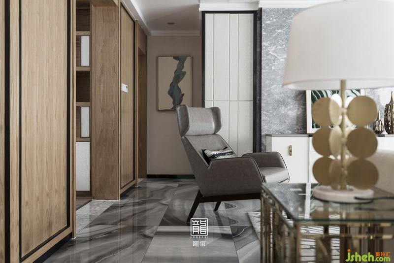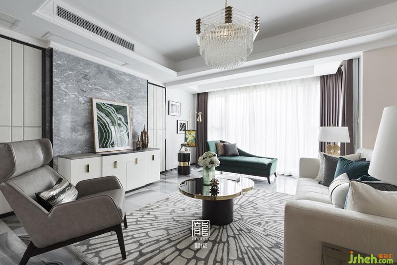 客廳地面上灰色大理石行云流水的紋樣,似涓涓細(xì)流,似云卷云舒。搭配碎石塊紋樣地毯,恍若夏日走過山間。讓人回想起自己光著腳丫踩在河邊石頭上的清涼,那簡單純真的開心模樣,頓時(shí)讓心中流淌出清爽和自然感。