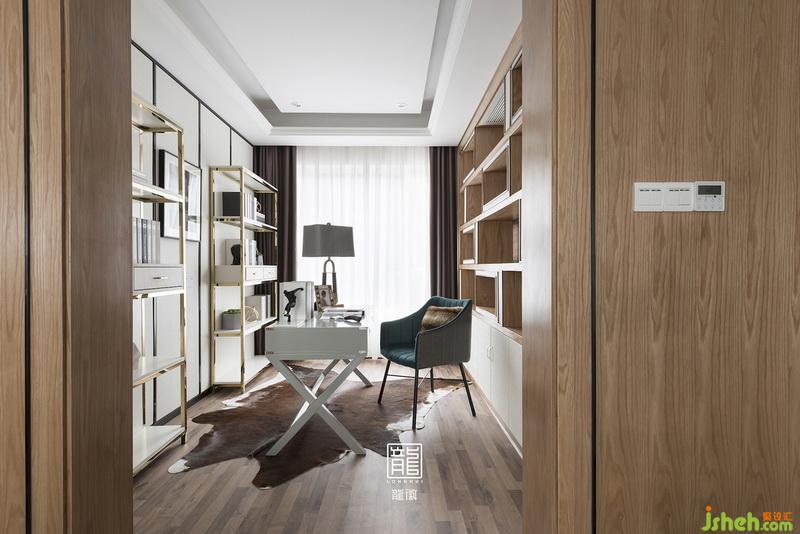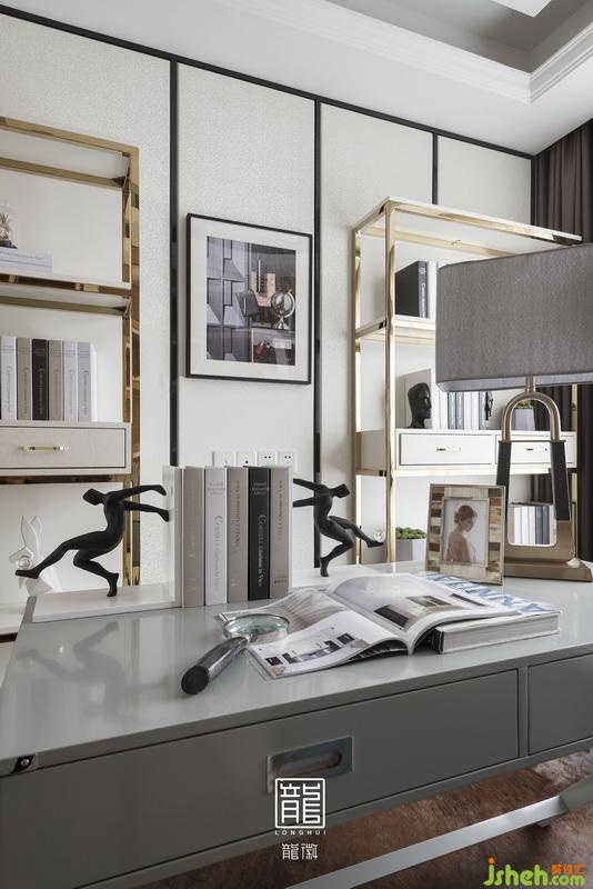 書房大面積暖白提亮空間,金屬線條點(diǎn)綴其中,流露出品質(zhì)感。桌椅簡潔的造型,干凈利落。在這里,工作的樣子或讀書的姿勢都變得尤為迷人。