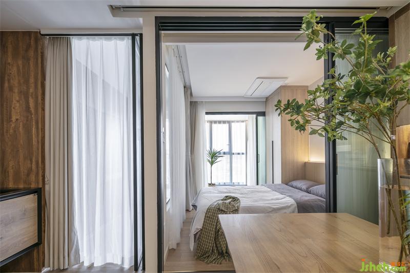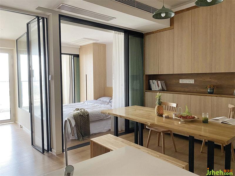 S姐姐的家原戶型是一房一廳,家里幾乎沒有承重墻可以實現(xiàn)很多大膽的設(shè)計想法!經(jīng)常出差日本的她住酒店get到了很多日式收納精髓,所以對新家在收納上劃了重點,他們兩夫妻的生活方式很特別,打破了傳統(tǒng),客廳不需要大沙發(fā),以原木大書桌為中心,吃飯,辦公,看書,統(tǒng)統(tǒng)在這張木桌上實現(xiàn)。