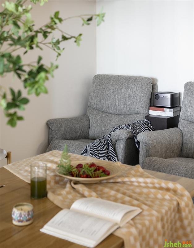 看電影的懶人沙發(fā),S姐姐說疫情期間可沒少坐在這個位置看電影,當(dāng)時家里的娛樂就靠投影儀了,晚上關(guān)燈后打開投影儀投射到天花上可以躺在主臥床上數(shù)星星,很愜意。