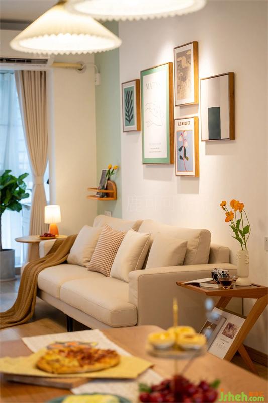 左面的背景墻留了一抹薄荷綠,與馬蒂斯這幅畫的留白綠框相呼應,搭配了蜜糖紅的單人位沙發(fā),使清爽的客廳增添了一份活潑的氛圍。