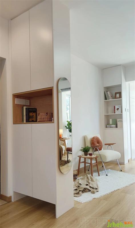 原戶型是沒有玄關的,在進門的位置設計了鞋柜,像屏風一樣,開門時(外賣,快遞)可遮擋外人的視線。