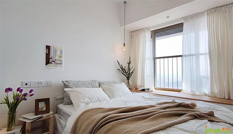 臥室是無主燈設計,整體是溫柔素雅的氛圍,實木飄窗點綴提升溫馨感。床頭背景沒有掛裝飾畫與墻飾,KK說以后旅行時慢慢淘自己喜愛的具有紀念意義的掛畫。