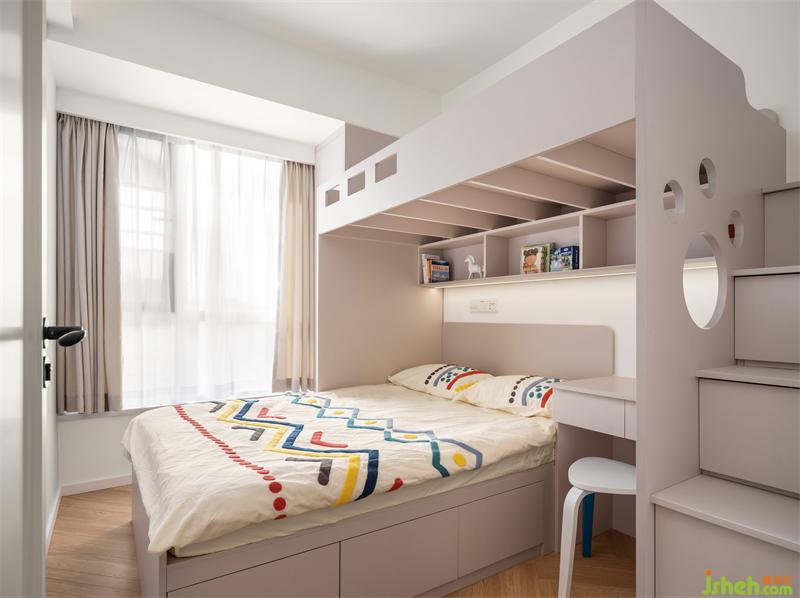 兒童房設(shè)計了上下床,儲物步梯,下面是1.5米的床,旁邊是小書桌。