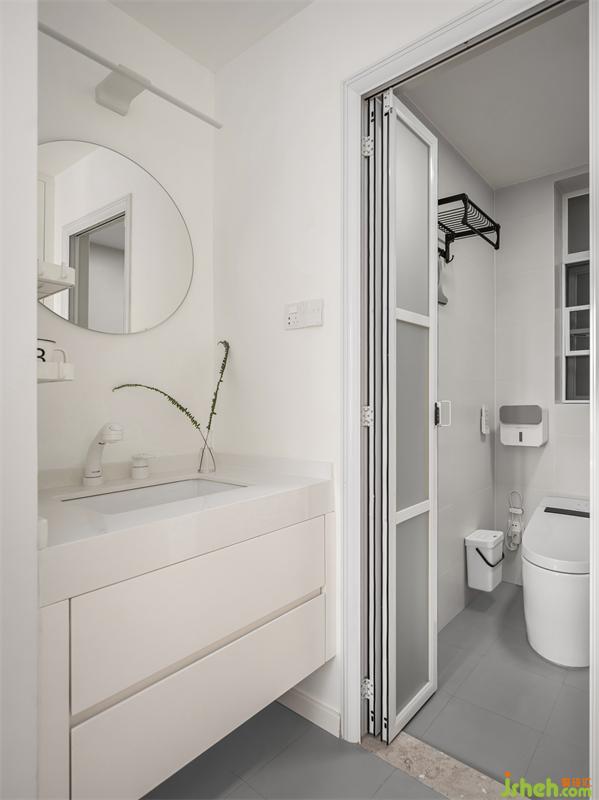 洗手間利用了一點點臥室的空間做了干濕分離,洗手臺外置,還做了一個生活用品儲物柜巨能裝