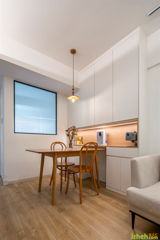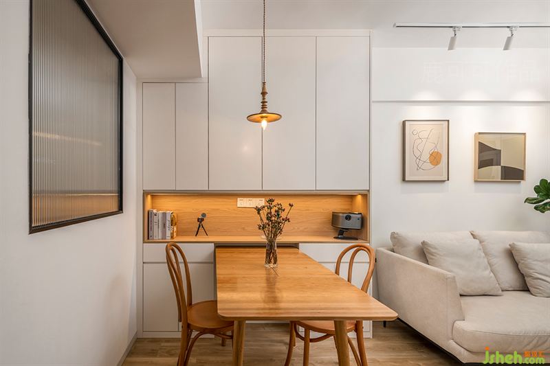 餐廳靠墻做了頂天立地的餐邊柜,啞光白的質(zhì)感弱化柜子的厚重感。展示中心設(shè)計(jì)中空位置加了原木元素,放置一些小家電與就餐常用品很方便,不用起身就可以拿到。中空部分用了觸摸式燈帶。