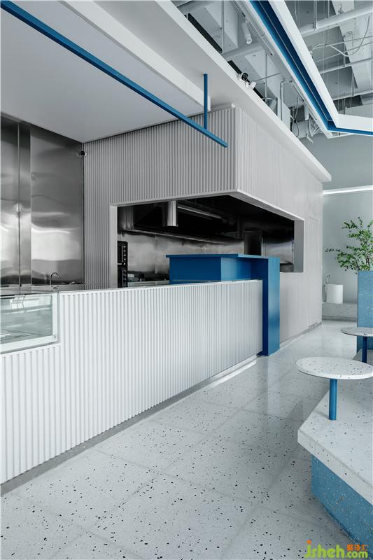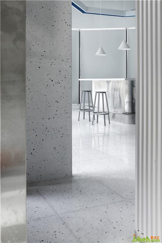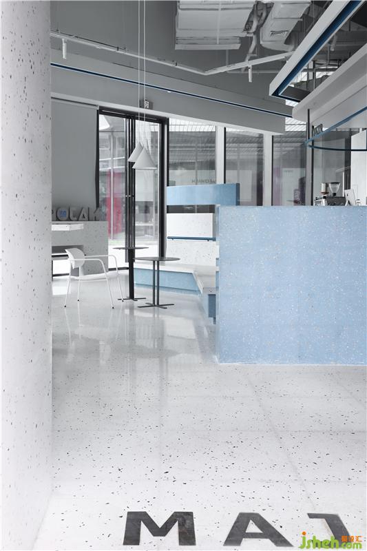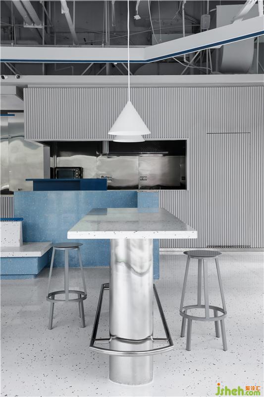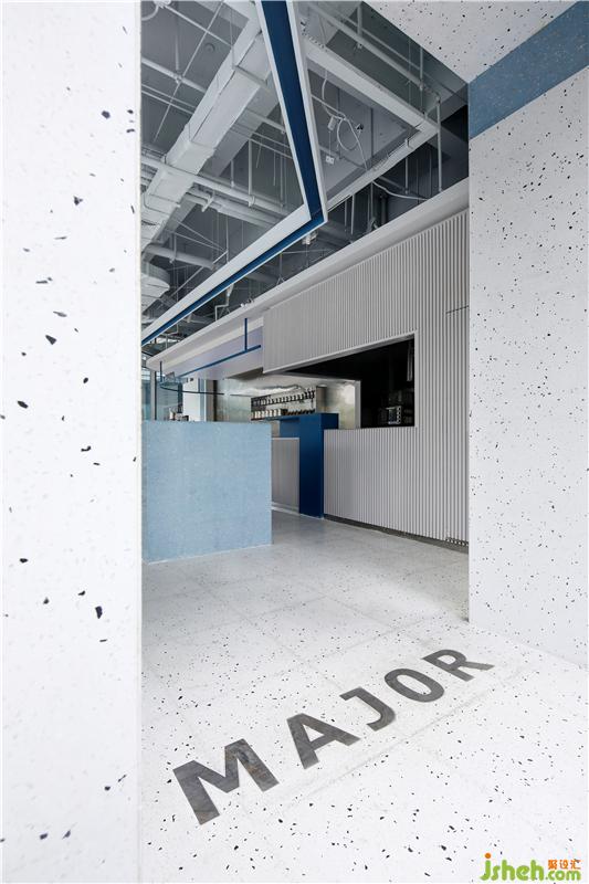 餐廳設(shè)計(jì)在整體室內(nèi)空間上,設(shè)計(jì)團(tuán)隊(duì)突破傳統(tǒng)商務(wù)風(fēng)格的沉重色調(diào),提取了MAJOR的品牌標(biāo)志色——藍(lán)色、白色,與金屬進(jìn)行碰撞,時(shí)尚而又清新。不銹鋼與顆粒感的水磨石,為整個(gè)空間帶來(lái)獨(dú)特的肌理感的同時(shí)并賦予精致的細(xì)節(jié)和空間特征。