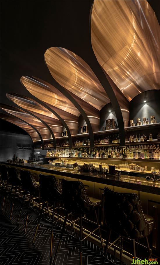 ▼酒吧局部,泛金色的金屬質(zhì)感融入到整體空間中