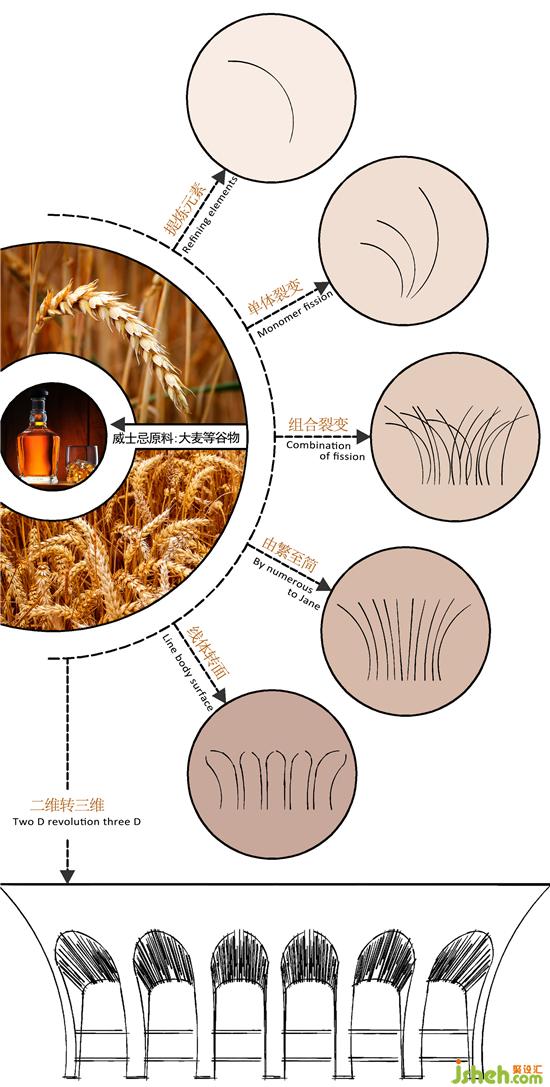 概念源自于制作威士忌的原料(大麥),本空間以“大麥”為主要提煉元素,先由單一的自然形態(tài)到組合裂變形態(tài),再由“繁”至“簡”轉(zhuǎn)換形態(tài)并植入到以酒吧中部為核心的主酒架區(qū)域,突出為之相聯(lián)的主題。泛金色的金屬質(zhì)感融入到整體空間中,進一步體現(xiàn)威士忌的固有色,并在燈光的映射下顯得流光溢彩,光影之間猶如半畝方塘一鑒開,天光云影共徘徊。酒吧設(shè)計