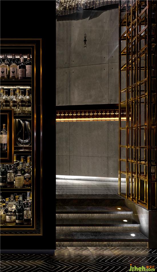 在整個空間的視覺上以黑/金色為主基調(diào),營造一種神秘的高貴感。黑/金色的搭配與碰撞一直是時尚界的寵兒。黑色,作為一個強大的色彩,它可以很莊重也可以很高雅,是一種具有代表多種不同文化意義的顏色。金色是金屬金的顏色,具有光澤,它是大自然中至高無上的純色,象征太陽的顏色,代表著溫暖與幸福。本空間的金色概念更多的是為了體現(xiàn)威士忌酒本身的固有色,在不同的燈光呈現(xiàn)下映射出不同的金色,也如同表達一種不同年份的威士忌酒該有的色彩。