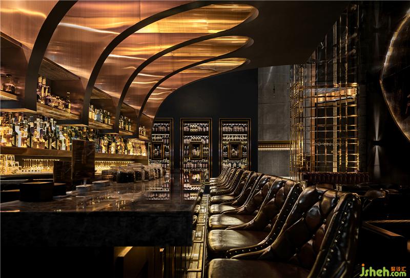 ▼中央主酒架/吧臺區(qū)域,整個空間的視覺上以黑/金色為主基調(diào)