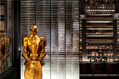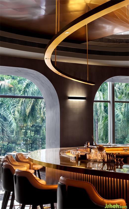 空間中心處,以威士忌酒中固有色的“金色原漿”為藝術(shù)原型,深圳酒吧設(shè)計(jì)以水為題,意為一尺水,百丈波,滔滔不息,使韻律及活力得以在空間中傳遞,同時(shí)也象征著新生。喻比莊子筆下《逍遙游》水擊三千里,摶扶搖而上者九萬里。