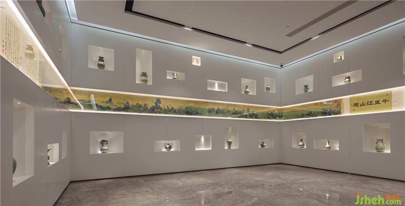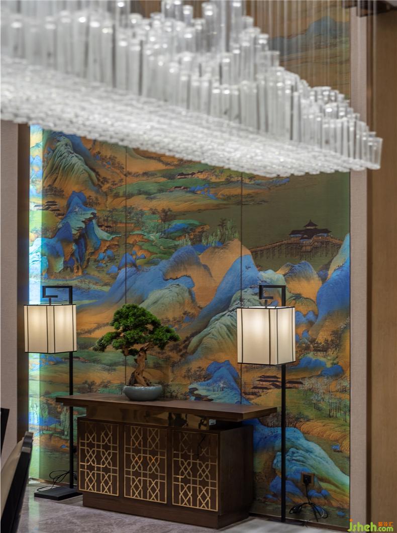 我們把傳世之作《千里江山圖》采用素有國寶之稱的汴秀進(jìn)行一比一還原展示締造空間的瑰麗,絨彩奪目,名繡佳作,競相生輝。以汝窯和官窯的元素以彰顯簡美思想,每一件器具皆是精心挑選,體積、顏色、紋理等不同形態(tài)的呈現(xiàn)對(duì)空間美感的縈繞。