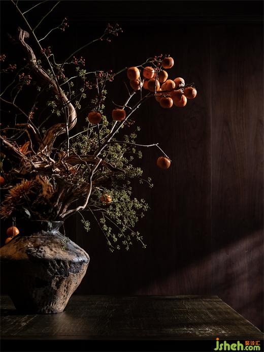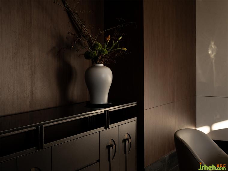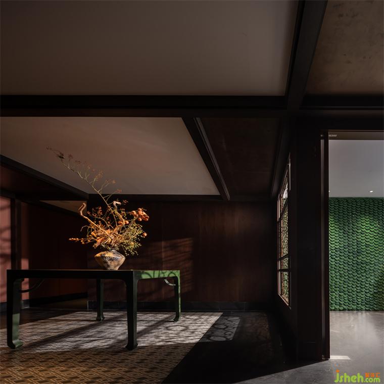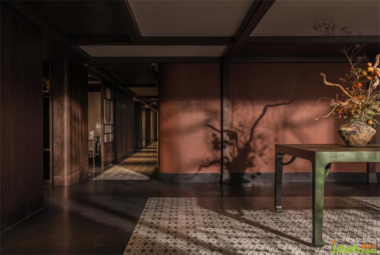 紅墻下,以花磚復(fù)現(xiàn)織錦地毯紋樣,典雅潔凈。古典案幾搭配花藝瓶插在公共區(qū)營(yíng)造出文人畫(huà)卷中的虛擬空間,與中國(guó)傳統(tǒng)空間中的格物理想遙相致意。