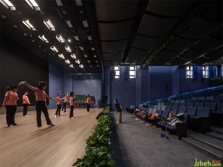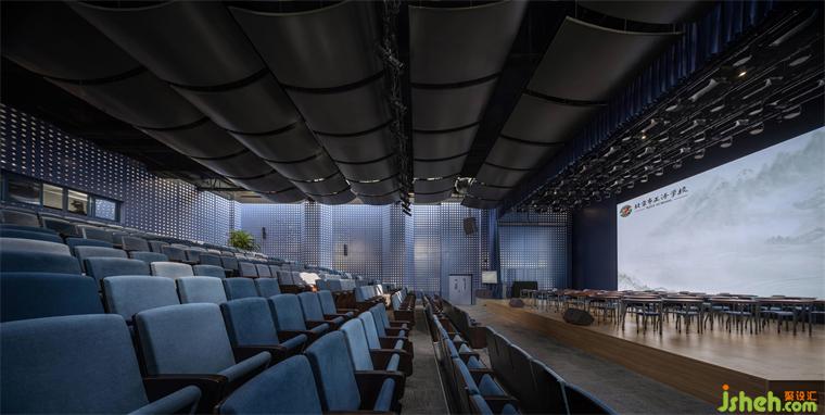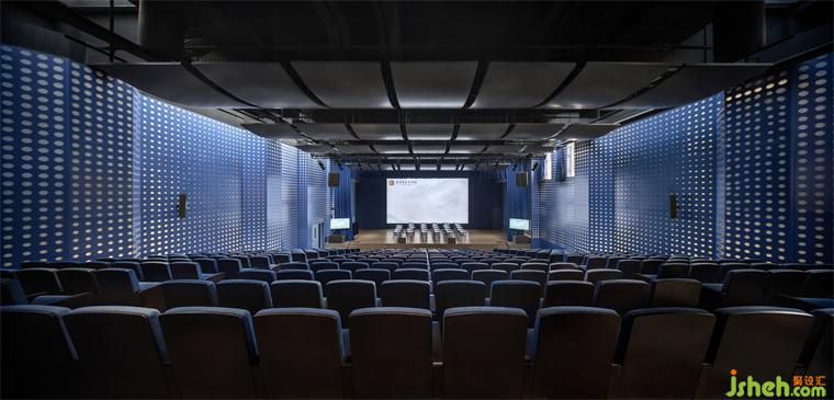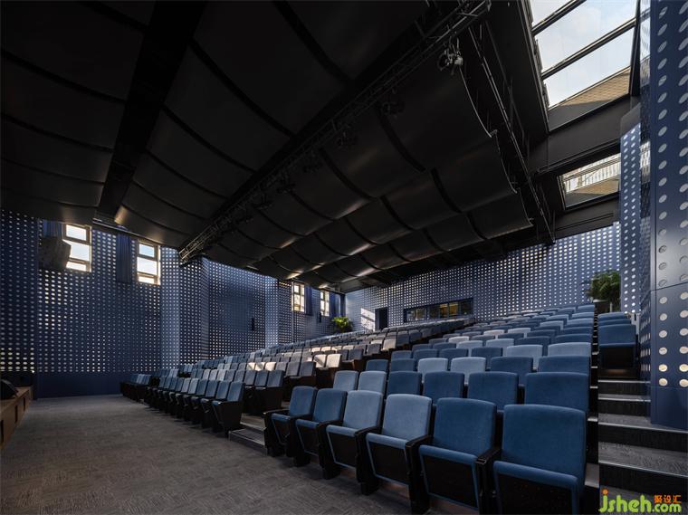 在倉庫空間里支起活動鋼架,使這里可以作為一個300座的階梯式報(bào)告廳。這個功能性空間以聲學(xué)設(shè)計(jì)為導(dǎo)向:學(xué)校裝修設(shè)計(jì)空中懸掛的導(dǎo)聲板力圖讓空間里的每位學(xué)生有幾乎相同的音質(zhì)體驗(yàn)。同時(shí),墻身上的孔洞既達(dá)到吸聲功效,其特殊的參數(shù)化設(shè)計(jì)圖形也呼應(yīng)了正澤學(xué)校精神層面“澤”為“水”的意象。