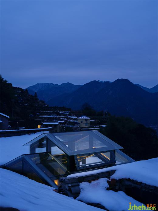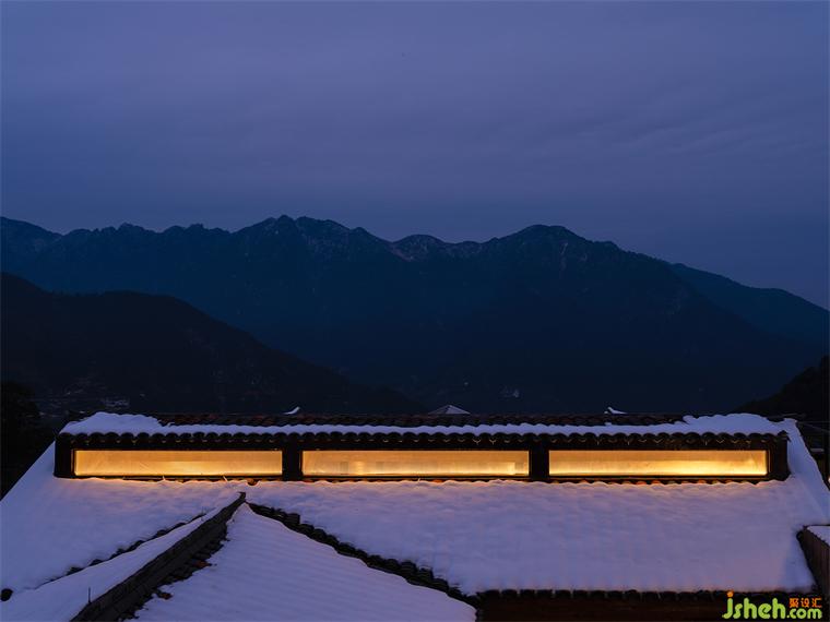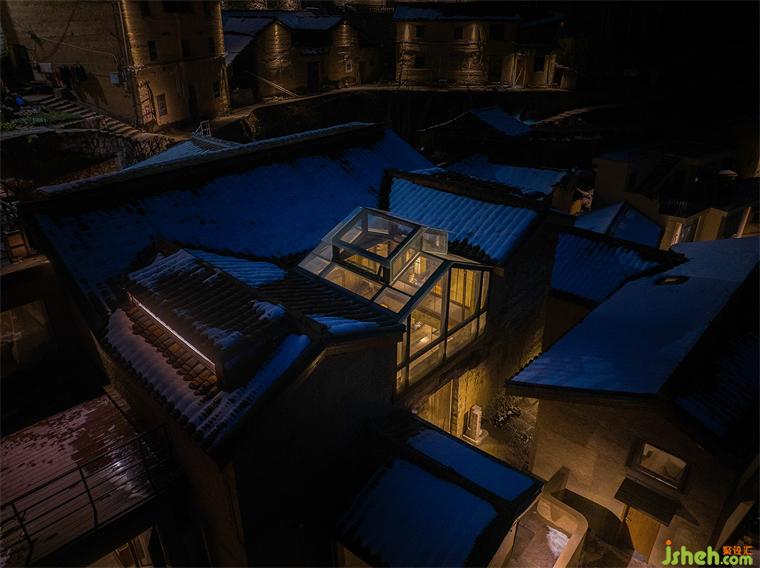 建筑坐落于陳家鋪村最為熱鬧的地段之一,從山頂俯瞰,很輕易就能憑借玻璃天頂?shù)脑O(shè)計特征聚焦到它的所在。博物館設(shè)計澄澈剔透的一方天頂如一面旗幟般書寫陳家鋪村的“新地方志”。它給予了村莊第一個可以停留的公共空間,也將村子的日常生活與文脈呈現(xiàn)給遠道而來的人。