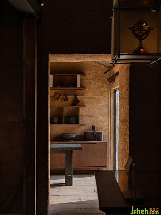 西南角的廚房在常見的桌、廚之外,合伙人陶睿專門搜集了一件地域性極強的蓑衣。山林中的松陽常常會迎來雨的光臨,村民出門前隨手穿上蓑衣就能在室外活動自如,老物件如神來之筆。
