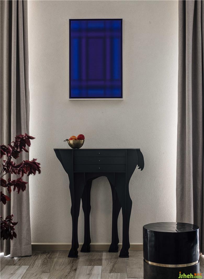 上面搭配的一幅藍色平面的畫,是藝術家崔云峰《序視》的系列作品之一,他用冷暖、虛實、明暗、筆觸構成的視錯覺,形成一種向內的空間關系,激發(fā)出了一種只屬于色彩的能量,生成出了一種純粹的視幻覺效果。