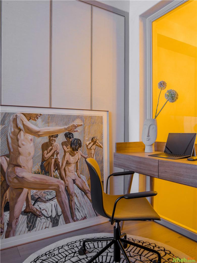 這個空間的功能是書房兼衣帽間,一面明黃色的透光玻璃將明亮和溫暖同時帶來;風格和顏色會隨時間的消逝不再是重點,而充滿溫度的記憶的物件才能夠長久留存,一幅劉小東的畫作就作為承載記憶的載體,鎖住瞬間成為永恒。