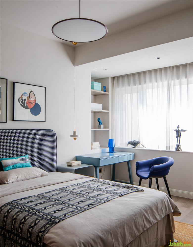 墻角的弧線處理與陽臺呼應,一氣呵成,很簡約的細節(jié)設計對房間的采光有著意想不到的效果。相比白墻,藝術(shù)漆肌理墻面可以將物品的光彩放大。皮粉色的床和地毯,為空間賦予個性和溫度。
