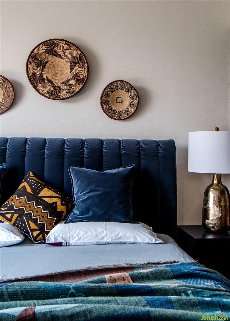床頭的手工制品,工藝精湛,歷久彌新,搭配深藍色天鵝絨材質(zhì)的床,再添一把橙色的扶手椅,賦予空間一種優(yōu)雅又異域的氛圍。