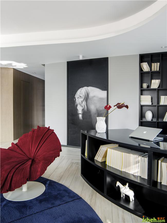 溫潤(rùn)的弧形辦公桌與弧形的空間形成呼應(yīng),外嵌至辦公桌上的書架和內(nèi)嵌至墻面的書架上的書本,給空間一種連貫的語言,高低錯(cuò)落間這些書本成為了漂亮的裝飾品。