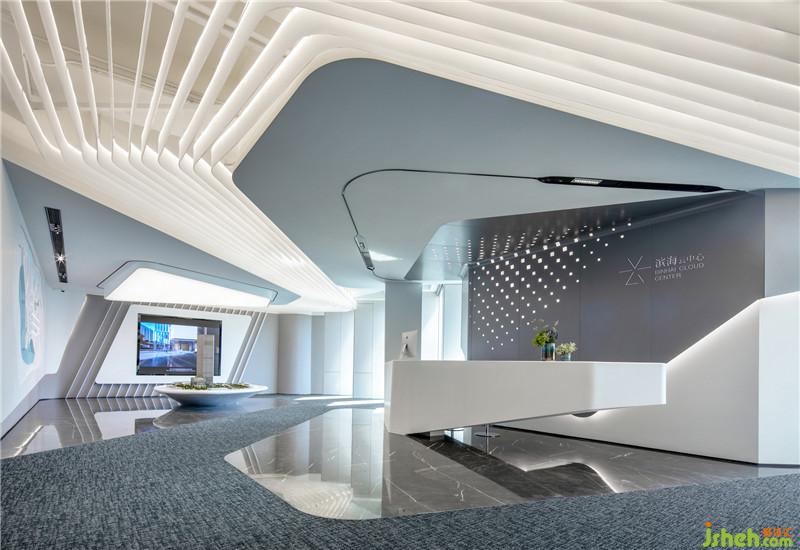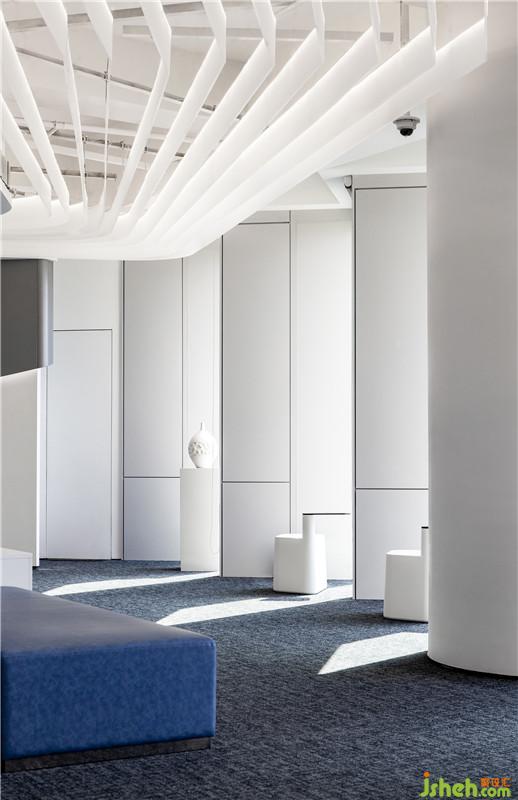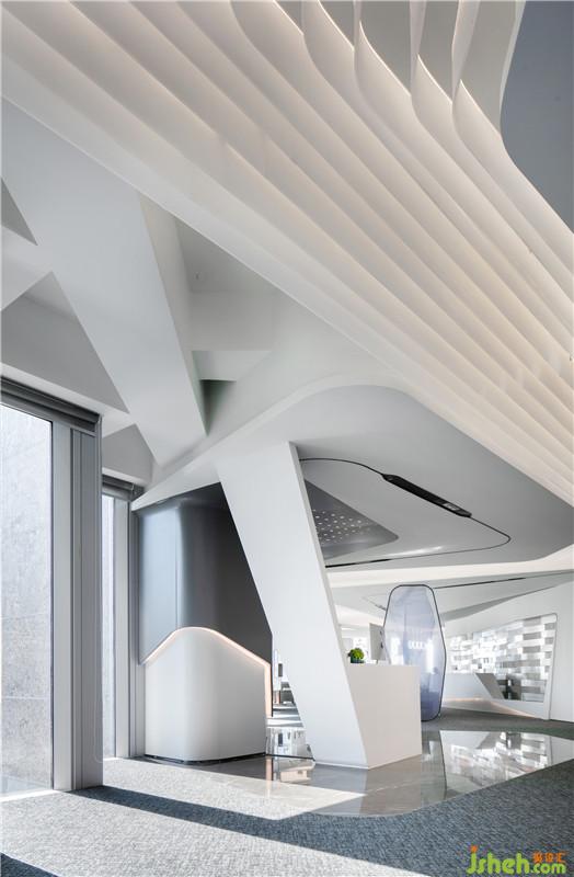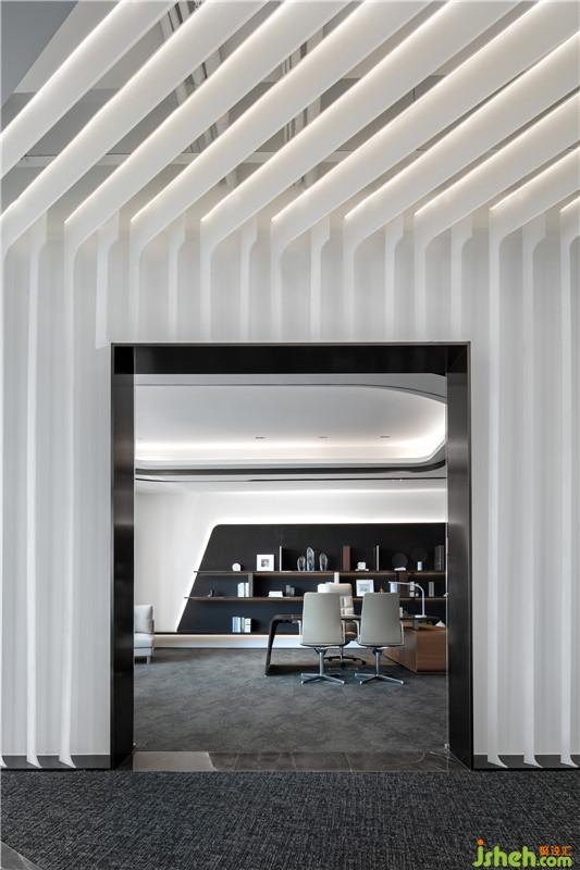 在設(shè)計(jì)語(yǔ)言表達(dá)方式上,設(shè)計(jì)師以簡(jiǎn)潔的白色折線形態(tài)做為空間的主導(dǎo)元素,以游動(dòng)、穿透、回旋與韻律作為空間的主題,起伏的白色亞克力天花折面造型以其簡(jiǎn)約的線條和充滿未來(lái)感的設(shè)計(jì)語(yǔ)言勾勒出兼富有節(jié)奏且兼具人文感和科技感的共享立體空間。而空間里深色石材與淺色地毯的序列排布,則以厚重感與輕盈白色天花頂?shù)目侦`相依存,輕盈且富有空間張力,進(jìn)一步打造出空間的層次與韻律。公區(qū)、玻璃窗邊可拼接組合椅及軟裝藝術(shù)品的陳列,每一處都變成設(shè)計(jì)的誘導(dǎo)者,引領(lǐng)來(lái)訪者的好奇心,直至抵達(dá)下一個(gè)空間情境。設(shè)計(jì)公司