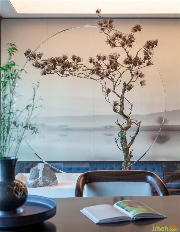 以茶待客,乃古代人情交際的禮節(jié),它為友人之間帶來一種清幽雋永的意境。作為與友茶話的私享地,我們以框景的造景方式,引入內(nèi)置庭院概念,用枯山水加以詮釋和白色石子烘托氛圍,再將透明玻璃將茶室與包房視野聯(lián)匯貫通,形成對(duì)景。踩石踏景步入,恰到好處的完成了過渡,也渲染出一種定神凝氣的儀式感。草木嵌頂、中式傳統(tǒng)邊柜與枯藤裝置等在此則轉(zhuǎn)變?yōu)榭臻g的表達(dá)語言,構(gòu)建起人、茶、景、情、境間的存在與通融。設(shè)計(jì)公司