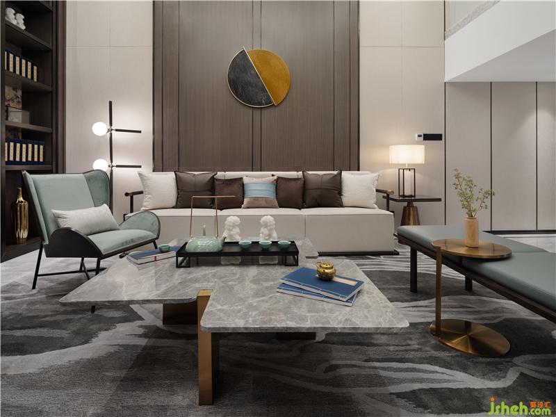 無論是從其呈現(xiàn)的風(fēng)格美學(xué),還是賦予人的極致體驗(yàn),呂邵蒼設(shè)計(jì)在人文生活情景上的深度打磨都值得贊嘆。在負(fù)二層會(huì)客廳,設(shè)計(jì)師賦予空間場景以靈動(dòng)的詩意 —— 一池春水匯于線條蜿蜒的捫布之上,與蒼翠的松樹端景、不規(guī)則走線的雅灰地毯形成虛實(shí)的映襯,以一種返璞山水與林間的自然意境,實(shí)現(xiàn)私密會(huì)客、親朋暢聚的休閑空間。