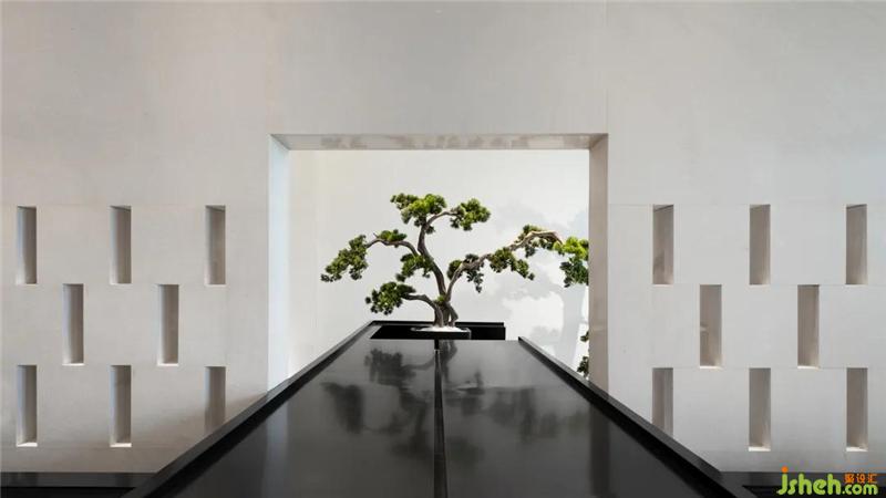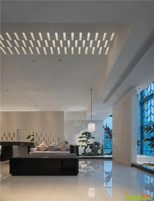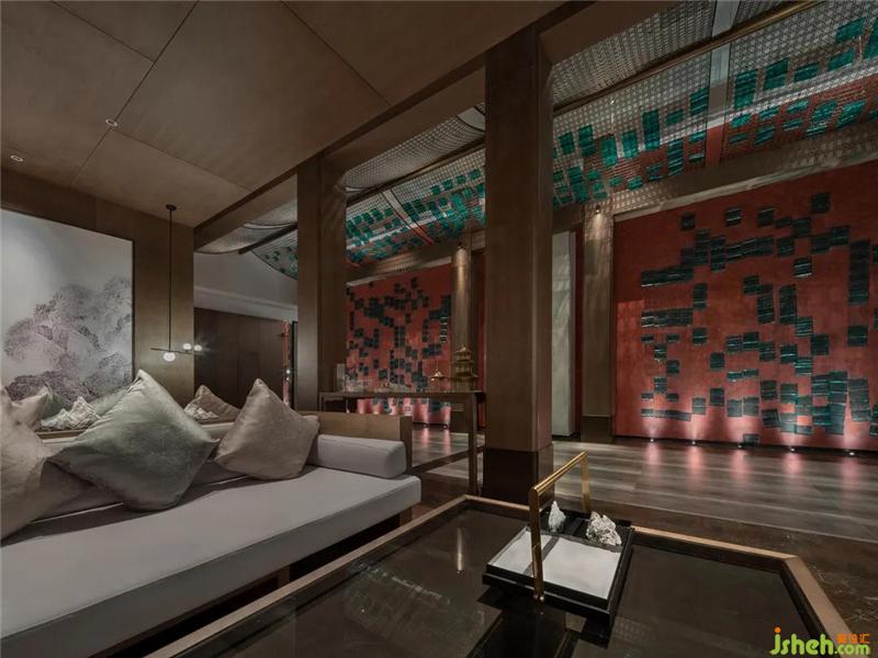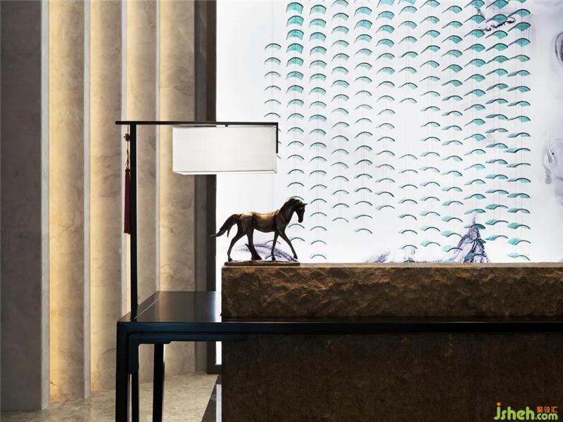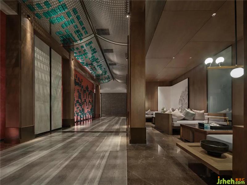 設(shè)計師以濃墨重彩的力度來描繪過渡場域的東方氛圍,從用色到用材,從結(jié)構(gòu)到立意,延伸過道的縱深視覺感,實現(xiàn)煙波浩渺而意境悠悠的江南風致。