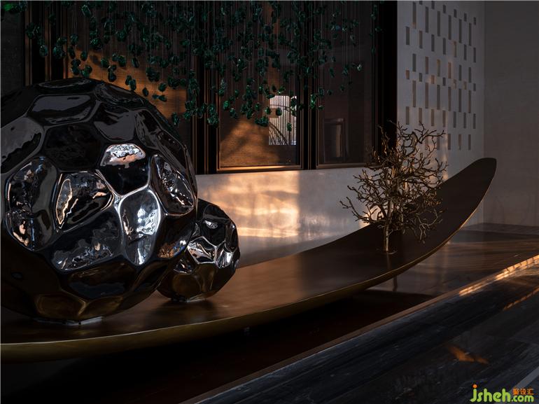 如乘船緩入,等候區(qū)域的走廊則更加深了江河暢流的觀感。兩側的燈帶似是河岸聳立,光影的投射中,悠長而靜謐的河道徐徐向遠。水療設計精巧鍍金鋼絲工藝的藝術裝置似扁舟一尾、又如落木一葉,在霧靄沉沉的山水背景里,隨漫天星霜而搖曳。