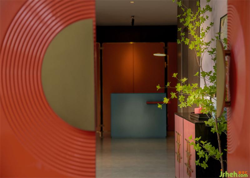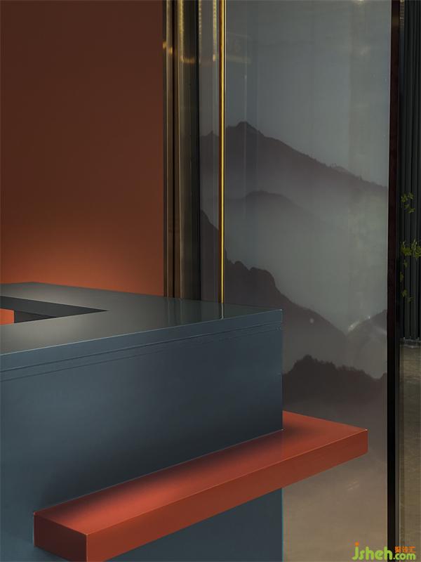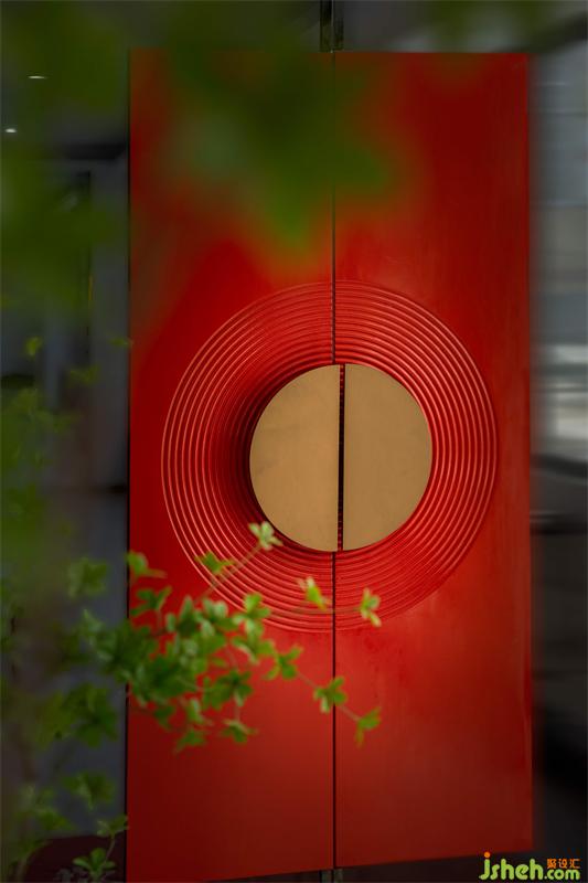 朱砂漆大門通過一種更加自然質(zhì)樸的東方美學(xué)方式同時(shí)融合典雅輕奢的黃銅拉手,重新定義奢華和富饒。前臺(tái)區(qū)的懸掛式臺(tái)燈一束柔光,將人們的視線引向這個(gè)亮點(diǎn)突出的視覺效果從而增加了空間和物體的立體感。The door with cinnabar lacquer redefines luxury and richness through a more natural and simple oriental aesthetic method while integrating elegant, light and luxurious brass handles. In the hanging desk lamp in the front desk area, a beam of soft light leads people's eyes to this bright spot, which enhances the three-dimensional sense of space and objects.