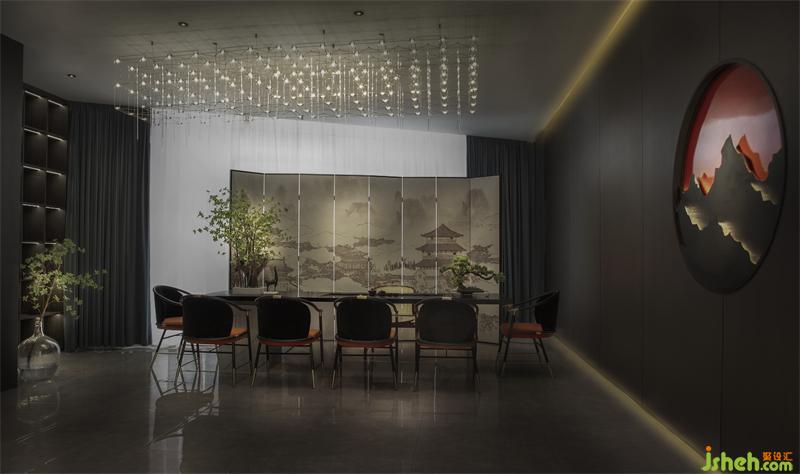 JUN用現(xiàn)代的材料與傳統(tǒng)的設(shè)計(jì)元素來演繹出富有建筑的古樸和端莊,也表現(xiàn)出一派安靜而祥和的景象,品茶區(qū)背景的折疊屏風(fēng)借鑒了輞川圖的山水建筑,墻面的造型提取了山的元素,通過現(xiàn)代的材料跟藝術(shù)裝置的手法來表現(xiàn),形成獨(dú)特的空間體驗(yàn)。