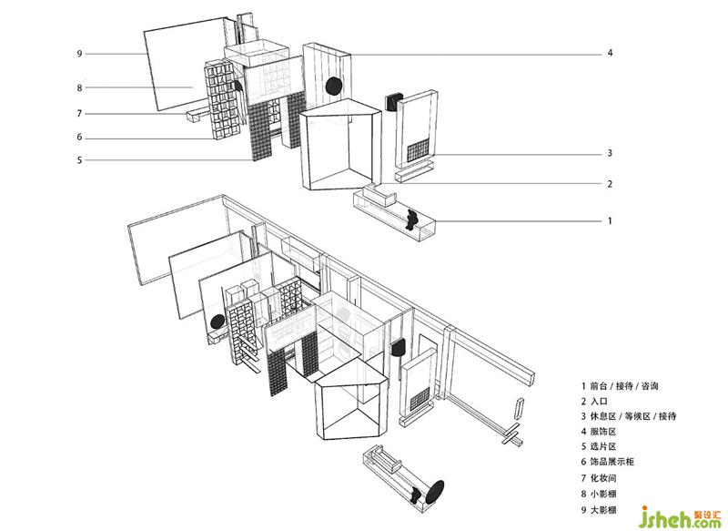 然而挑戰(zhàn)隨著到來,畢竟在150平米的小店內(nèi),規(guī)劃出10個功能分區(qū),每個分區(qū)的功能還要有足夠的空間滿足顧客的體驗。這種情況下,很容易給客戶帶來不好的體驗,所以在保證必要獨立功能的同時,重疊功能,借用過道分區(qū)的公共空間來做婚紗禮服展示。在兼具功能使用的同時,又不影響到過道的動線,從接待,等候休息,再到飾品道具,服裝,化妝造型的選擇最后進行拍攝,選片。整體的空間動線都圍繞著這拍攝流程來展開的。