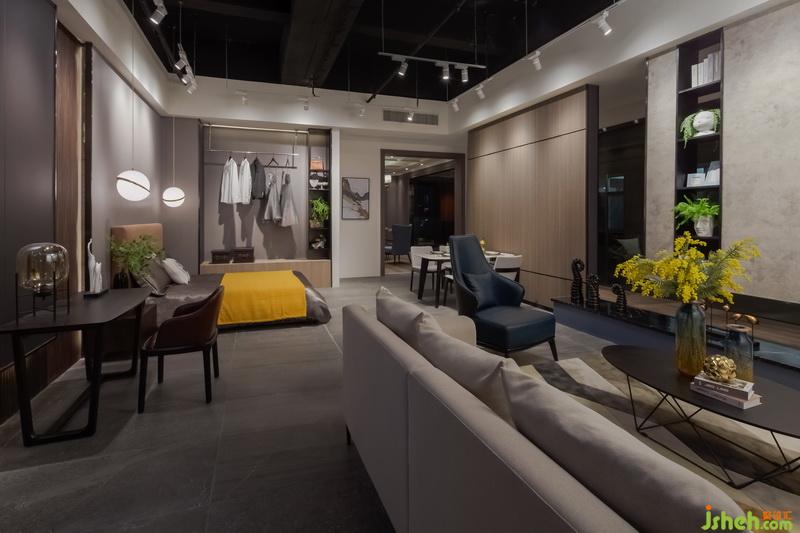 現(xiàn)代空間以黑白灰木為色調(diào),空間以概念性的方式模擬年輕一代的居住空間,同時也與櫥窗展示融為一體,虛實結合,把產(chǎn)品展示與空間情景模糊化,這樣子更能體現(xiàn)產(chǎn)品的可塑性與多元化的特點。
