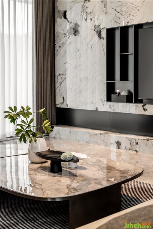 主要材料/仿石材瓷磚 進口巖板 檀木木紋飾面 膚感膜柜體飾面 布紋護墻板
