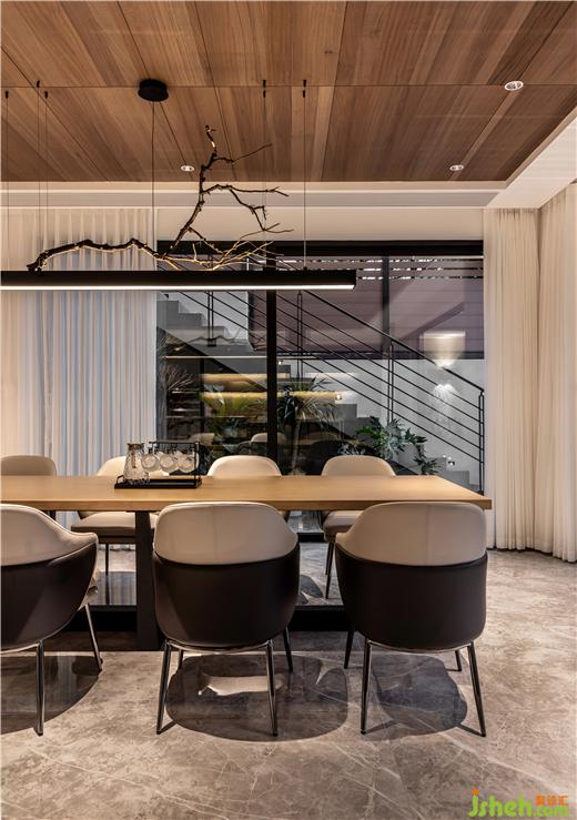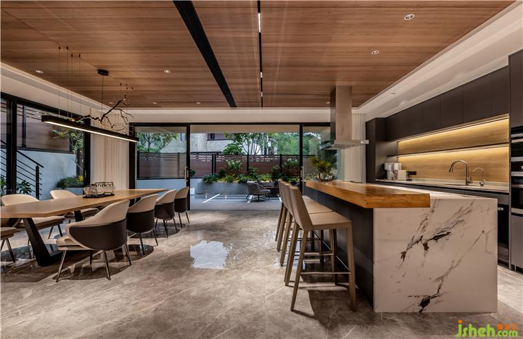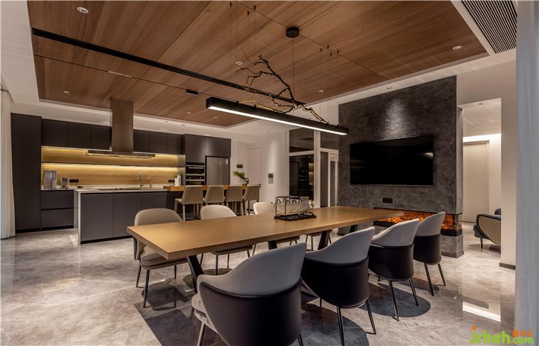 負(fù)一層為主人接待友人和家庭娛樂(lè)的空間,開(kāi)放式的西廚與用餐區(qū)形成很好的社交屬性,并穿插天花天然木紋的質(zhì)感表達(dá),佛山保利云上別墅裝修設(shè)計(jì)讓餐廚空間自成一體,深淺色塊的碰撞讓空間不止是使用,而是另一種視覺(jué)的享受。