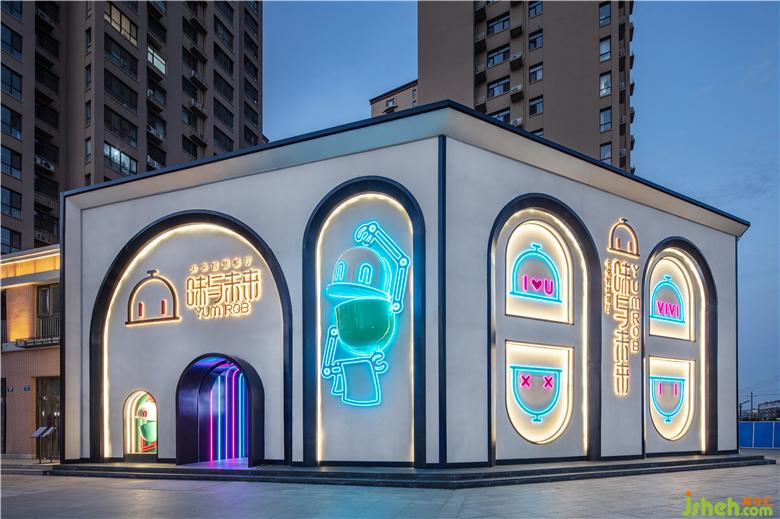將抽象的品牌概念,轉(zhuǎn)化為可感知、可傳播的空間語(yǔ)言,并為商業(yè)經(jīng)營(yíng)增加效益,是本案設(shè)計(jì)思考的核心。故而在門頭設(shè)計(jì)上,室內(nèi)設(shè)計(jì)師運(yùn)用了極具建筑感的形象,在不同方位立體化地展現(xiàn)“味”與“未來”。大膽鮮明的色彩布置,讓餐廳設(shè)計(jì)成為街道靚麗而醒目的存在。VIVI的卡通化IP形象不僅可以作為賣點(diǎn)吸人眼球,還可以形成自己的視覺符號(hào),增加品牌的辨識(shí)度。