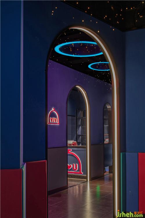 入口從品牌的機(jī)器人形象中提取出圓弧形元素,結(jié)合四周環(huán)繞的鏡面不銹鋼材料,帶給人們一種神秘跟未知感。彩色發(fā)光燈帶的運(yùn)用,打造甜蜜歡樂的視覺感受的同時(shí),呈現(xiàn)出場(chǎng)景的儀式感和迷幻感。