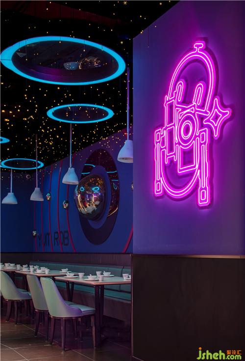 用餐區(qū)域提取品牌形象、未來感作為貫穿整個空間的元素,藉由天馬行空的設計手法對原有的空間進行了重新解讀。未來新科技元素的設計,擺脫了傳統(tǒng)餐廳設計的一成不變的沉悶感,置身其中仿佛漫步在未來時空。頂面的圓形鏡面與發(fā)光體的結(jié)合,營造相對靜謐舒緩的區(qū)域,賦予整個空間一種深邃的氛圍感。