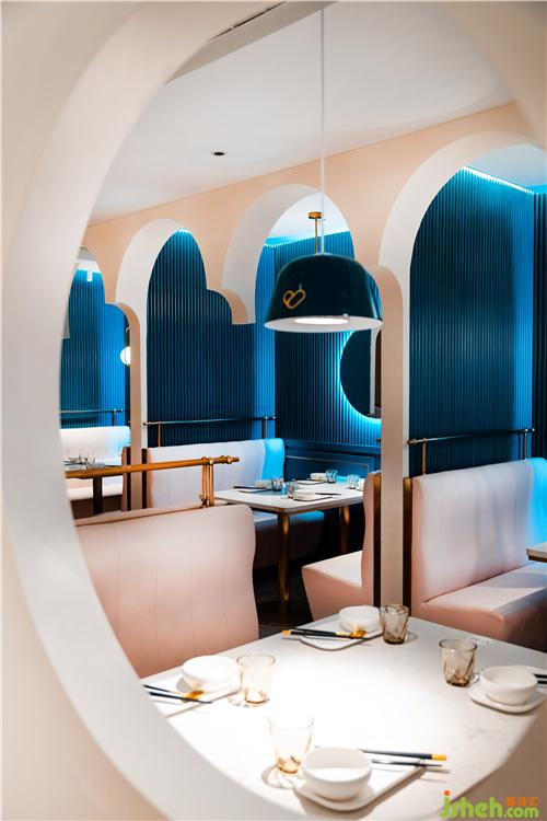 水紋不銹鋼在室內(nèi)形成一個(gè)充滿流動(dòng)性的天花空間,沖孔板拼接的"圍墻"隔而不斷,用幾何之形表空間之美。不僅提升了餐廳設(shè)計(jì)的體驗(yàn),也顯示出對(duì)傳統(tǒng)港式餐飲獨(dú)特而現(xiàn)代的詮釋。
