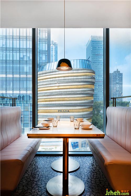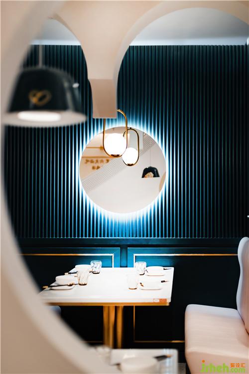 圓形鏡面結(jié)合暗藏的邊線燈帶,在擴大視覺空間的同時,光影與線條虛實之間的交錯,如輕紗遮面,靜謐中平添幾分神秘,使餐廳設(shè)計的空間每時每刻都呈現(xiàn)出不同的氛圍。