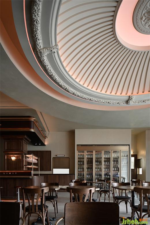 當(dāng)暮色余暉自落地窗角消散,晚間特有的燈光恰如日光與月色的輪轉(zhuǎn),映照出區(qū)別于日間的溫柔。餐廳設(shè)計采取日咖夜酒的經(jīng)營模式,為消費者在不同時段提供了更豐富的選擇。藍(lán)色的穹頂光與西方藝術(shù)中罕見的滿月相對應(yīng),將古典文學(xué)語境下的詩意與美感具化于現(xiàn)實。