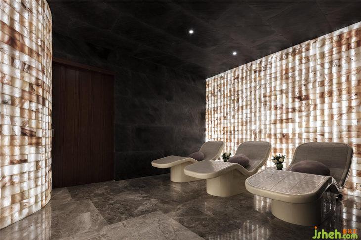 他將SPA區(qū)的設(shè)計原型定為地底溶洞,以深邃懸浮的震撼自然之景打造室內(nèi)空間,塑造出有形立體的混凝土立面。曲線雕刻的立面形體持續(xù)延伸,深沉地“懸?!庇诘孛嬷?,照明又增強了這種建筑張力,猶如置身溶洞。