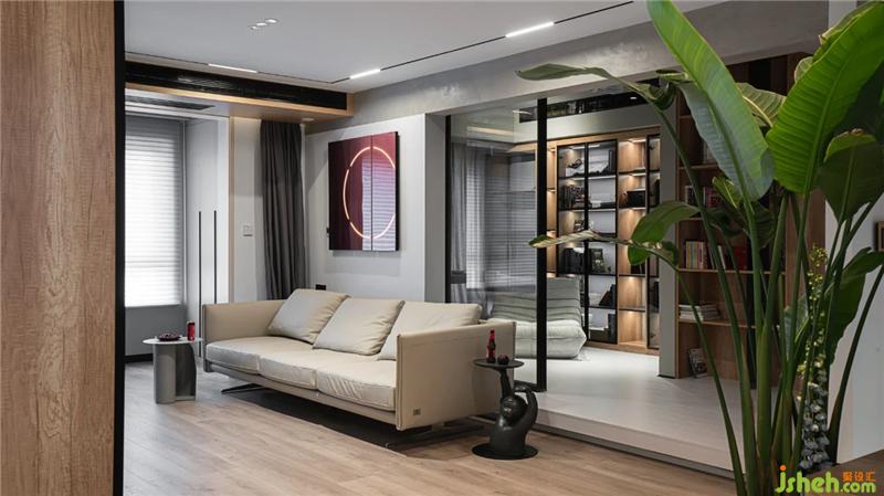 打通了客廳與書房之間的墻體,使整個空間明亮寬敞、開闊通透。照明采用了軌道燈搭配無邊框筒燈,無主燈設(shè)計時尚更具設(shè)計感。客廳的梁、墻面和吊頂用顏色區(qū)分做了互動,體塊之間的穿插突出了結(jié)構(gòu)之間的關(guān)系,增添了設(shè)計與美感。
