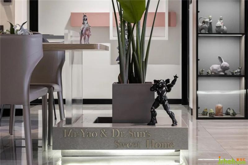 在入戶景觀植物的基座上,有屋主二人的專屬logo,是甜甜的小心思與愛意。并與亞克力的餐桌腿之間做了通透的銜接和穿插,成為入戶的亮點。