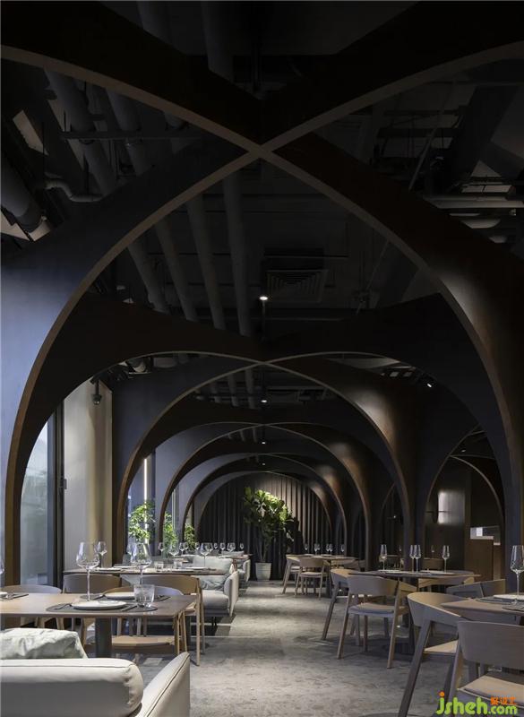大廳就餐區(qū)連續(xù)的十字拱帶來(lái)的秩序感。