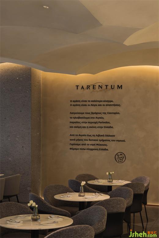 通往就餐區(qū)的走廊上有著等待人們發(fā)現(xiàn)的驚喜:餐廳設(shè)計(jì)走廊的起始端布置了放置雕塑的壁龕;走廊的盡端是希臘文撰寫的萄木文化墻。