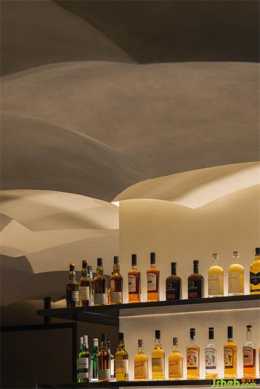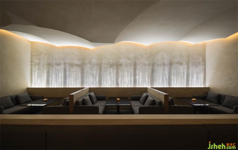 The straight linear light along the junction of the wall and the ground echoes the curved light arranged along the surface of the ceiling, which jointly sets off the lighting atmosphere of the wall and the ultimate dining experience.