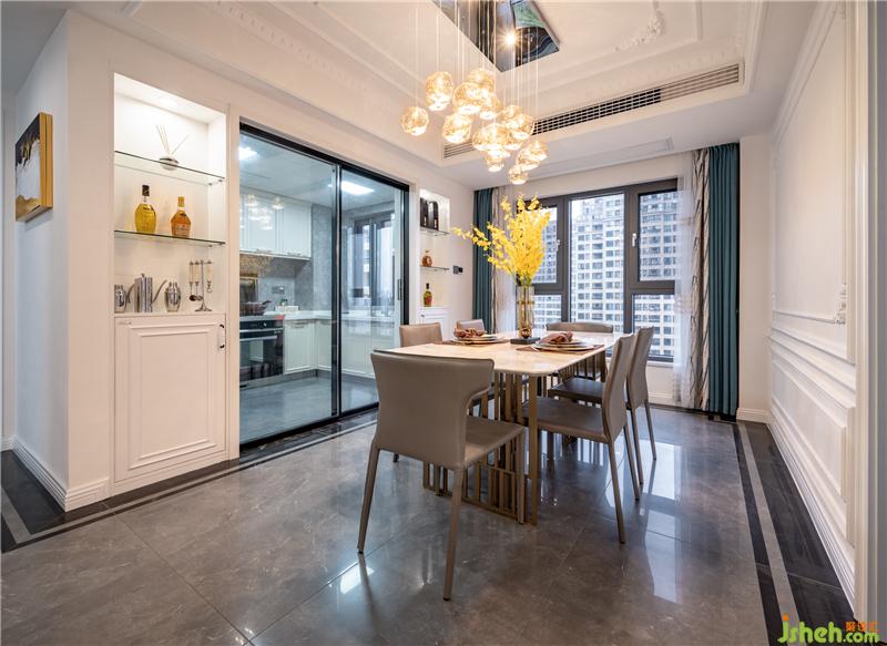 餐廳不再需要傳統(tǒng)的邊吊和射燈,如夢(mèng)幻泡沫般的玻璃藝術(shù)吊燈,一樣可以滿(mǎn)足空間照明,日落黃昏時(shí)的晚餐會(huì)更顯得有浪漫情調(diào),嫩灰色的餐椅、亮黃色的花卉。地面選用灰度太陽(yáng)石系列瓷磚,搭配經(jīng)典黑大理石瓷磚走